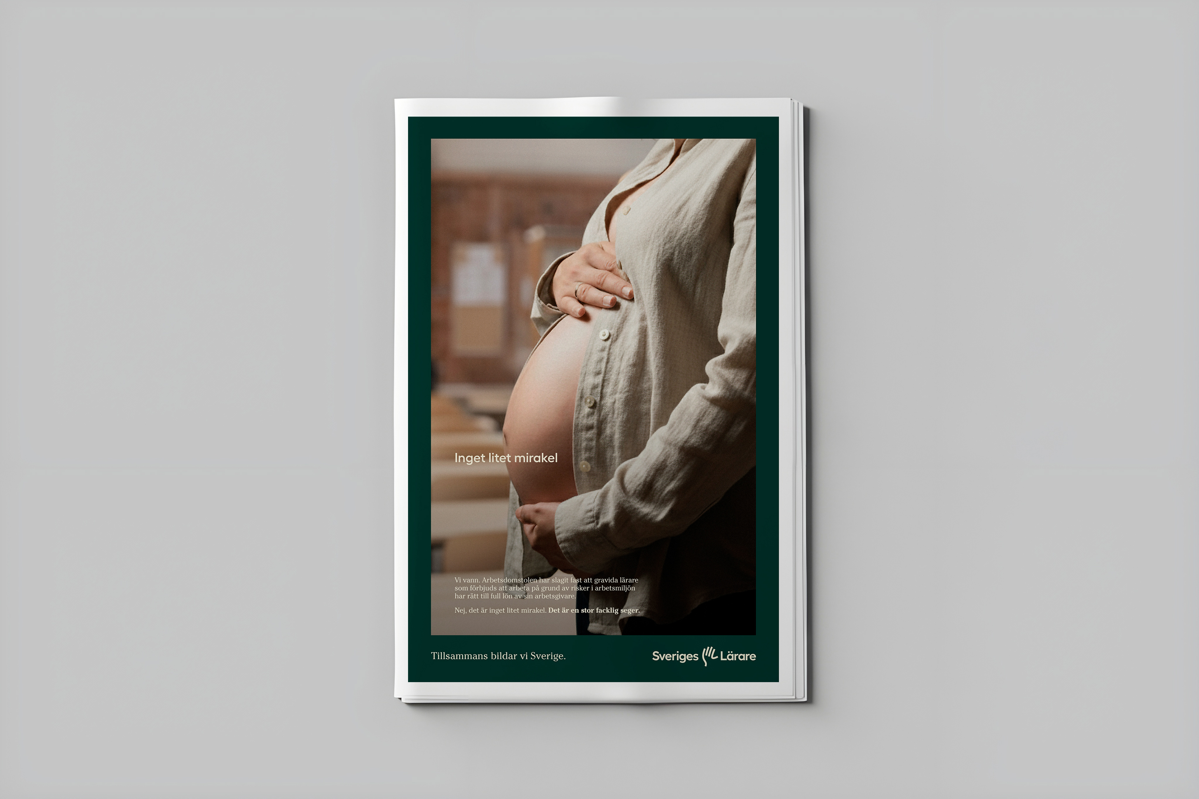 I mitten av augusti 2025 vann Sveriges Lärare i Arbetsdomstolen där det slogs fast att gravida som förbjuds att arbeta på grund av risker i arbetsmiljön har rätt till full lön. Beslutet innebär att de som tidigare nekats stöd har utsatts för diskriminering, något som var vanligt inte minst under pandemin. Domen väntas påverka lagstiftningen framöver och tvinga staten att anpassa reglerna till EU-rätten. Vi ville hitta ett uttryck som både hyllar segern och visar att den är resultatet av år av kamp och envishet.